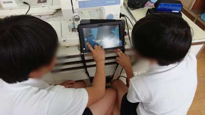 家庭科ではエプロン作りをしています。今日はポケットを作ったり、エプロンの端を縫ったりしました。タブレットを見て、ミシンの使い方を確認してから作りました。みんな、真剣な表情で取り組んでいました。