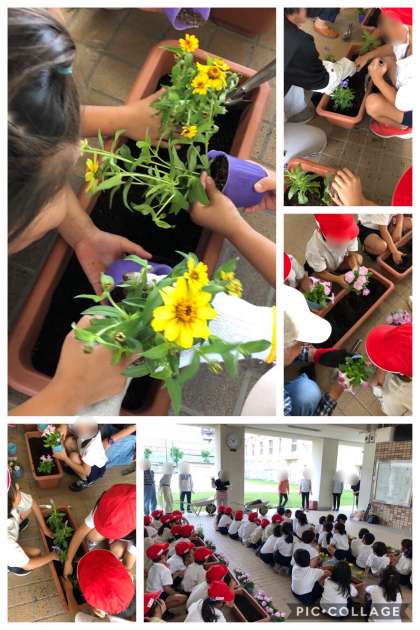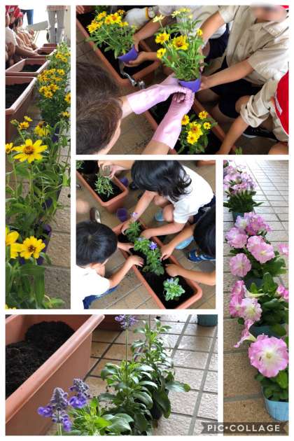 1年生はアサガオを育てているので、花の苗も優しく植えることができました。