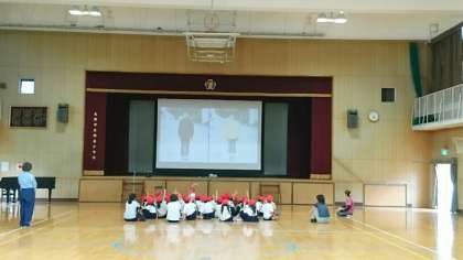 講堂でDVDを見ながら交通事故防止の注意点を学び、運動場では低学年は正しい道路の歩き方、中高学年は自転車利用時のルールを分かりやすく教えていただきました。