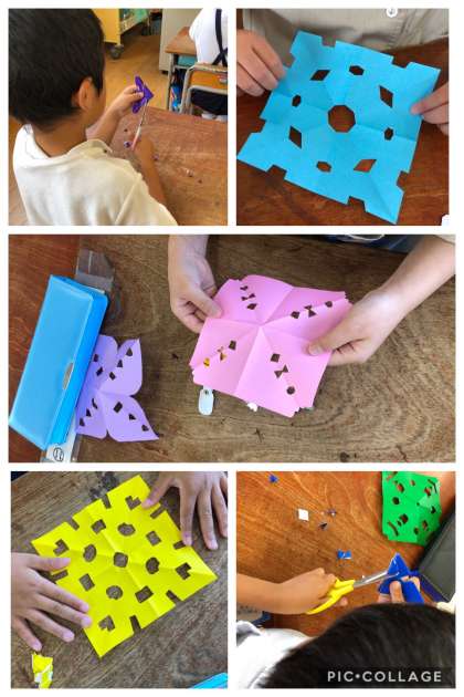 折り紙を折って、はさみでチョキチョキ。