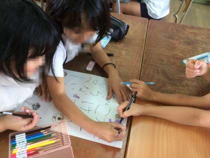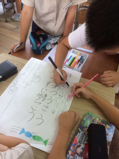グループで歩コーンのポスターを描きました。6月の玄関掲示に続いて、4年生が7月、8月の歩コーンの担当です。グループごとに工夫して描き上げました。