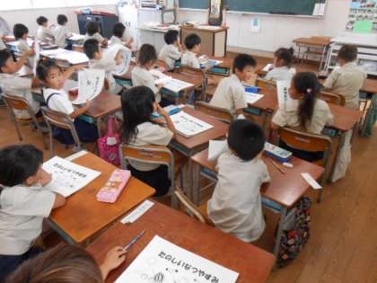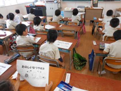 夏休みを前にして、1年生の子どもたちは梅香小学校の夏休みの宿題に名前を書きました。チラッとみるとさんすうやこくごのもんだいがたくさんあります。こんなにたくさんのもんだいができるのでしょうか?とふあんにおもうこどももいるでしょう。でもながいなつやすみ。すこしづつやればかならずできます。ひょうしには「たのしいなつやすみ」とかいてあります。もうすぐなつやすみ。がんばろうね!
