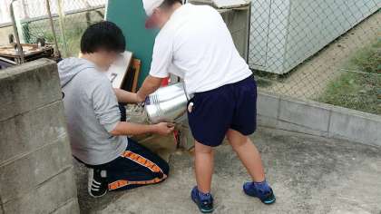 今朝の集会はたてわり班毎に集まり運動場の石拾いをおこないました。