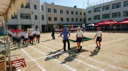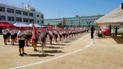 今日の全体練習は開会式の「入場行進」「開会のことば」等や特別競技の「みんなで大玉おくり」の練習です。