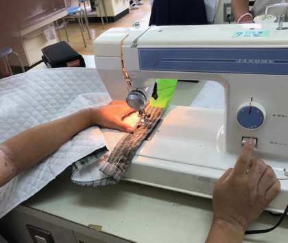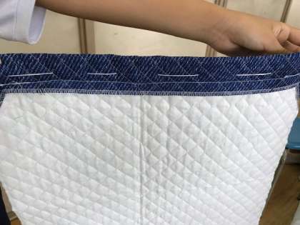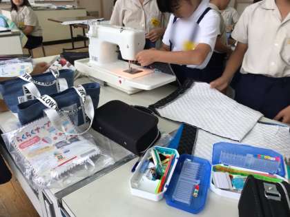 自然体験学習後にスタートした家庭科のナップサック作り。ミシンで縫うところをしつけをして、慎重に縫い始めます。縫い始めと終わりを返し縫いをして丈夫に仕上げていきます。