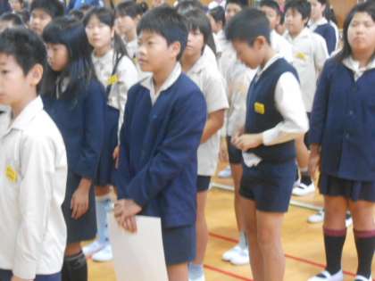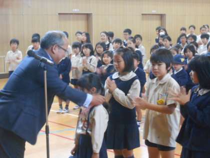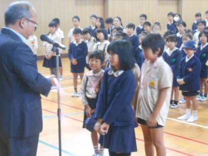 消防の絵画作品の表彰と月間30冊以上の読書できた児童の表彰がありました。