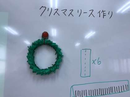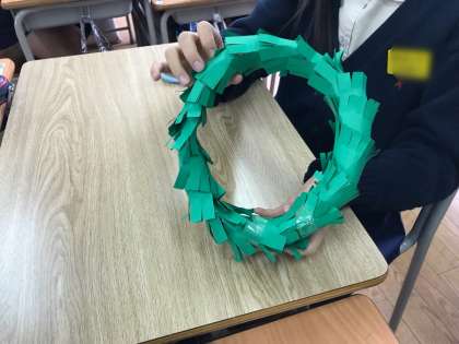 2学期最後の作品は、クリスマスの飾りです。新聞紙と色画用紙でリースを作り、飾りつけをしていきます。