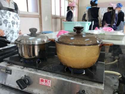 今日は調理実習で、ご飯とみそ汁を作りました。ご飯はガラスの鍋で、中の様子を観察しながら炊いていきます。噴きこぼれるくらいになったら中火。最後は弱火でじっくりと。