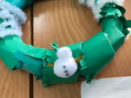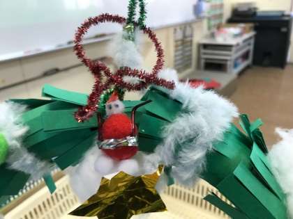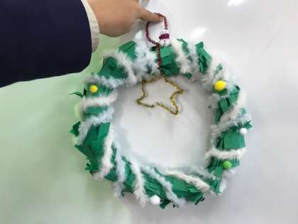先日のクリスマスリースの飾りつけを、図工の時間にしました。毛糸をまいたり、綿で雪だるまを作ったり、みんな楽しそうに飾りを作りました。来週には持って帰りますので、お家のどこかに飾ってください。