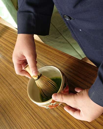先生に代わって代表の子どもが実際に茶筅でお茶を点てさせていただきましたが、混ぜても混ぜても全く泡がたたずシャブシャブの状態に…