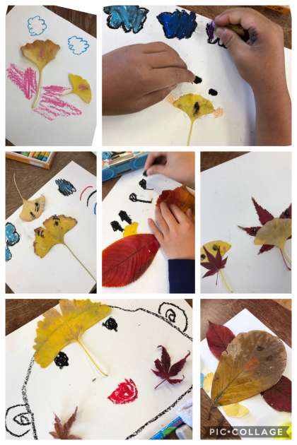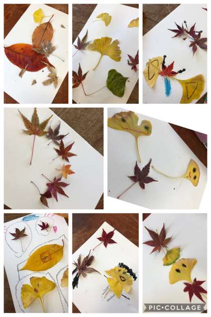今日はイチョウやカエデを中心に集め、落ち葉アートをしました。