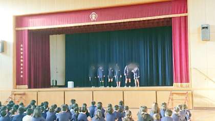 今日の集会はたてわり班に分かれて講堂で「集会委員の委員会発表」とゲーム「じゃんけん列車」をおこないました。