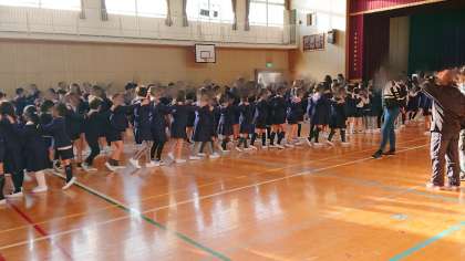集会委員会の司会進行で各委員会の活動紹介が行われた後、児童アンケートで集会人気No.1「じゃんけん列車」を通じてたくさんの友達と交流を深めて今年の集会を締めました。
