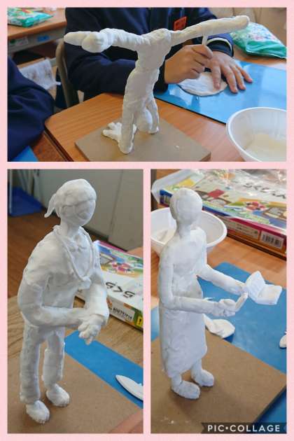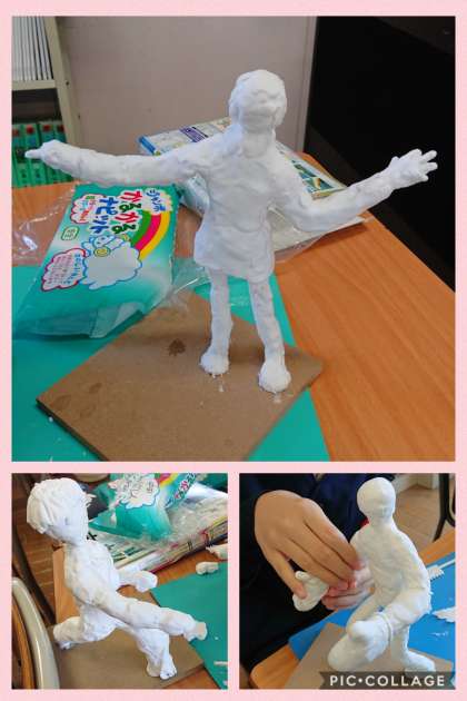 針金とプラスチックでできた芯材で人の動きを作り、工具で土台の板に固定し、次に芯材に紙粘土を貼り付けながら形を整えていきます。