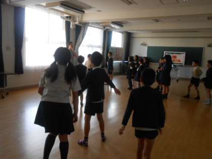英語活動でした。多目的室に入ってみると、先生が英語で言った色を見つけるという、色つき鬼のような活動をしていました。
