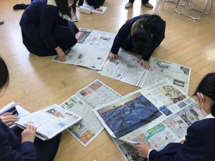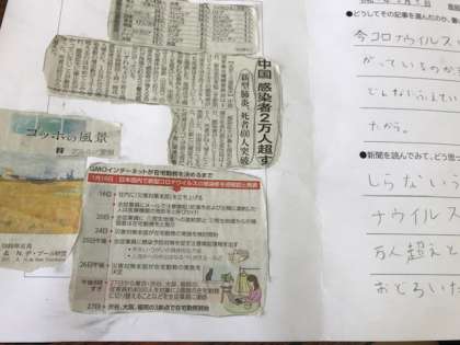 昨日の夕刊と、今朝の朝刊を一人1組ずついただき、自分が気になったニュースをスクラップするという活動をします。選んだ記事に一人一人の個性が出て、面白いなぁと思いました。