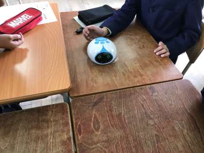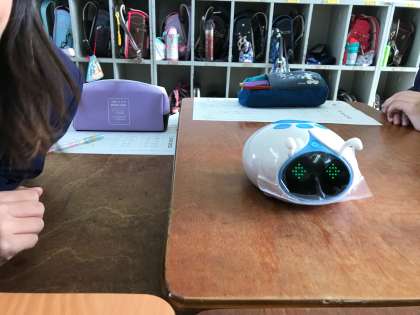 3時間目にアリロを使ってプログラミング学習をしました。教頭先生に教えていただきました。前進させたり、回転させりしました。歌も歌ってくれました。乱暴に扱うと「痛い」と言うので、優しく扱っていました。