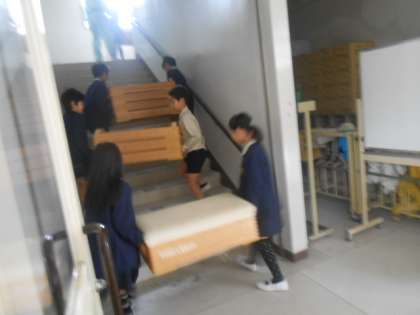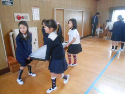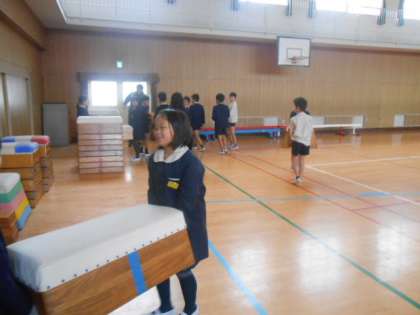 作品展に向けて、体育館に残っている跳び箱や平均台を運び出す作業を、5年生がやってくれました。