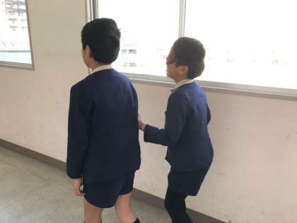 此花区の福祉協議会の方やボランティアの方々に来ていただき、アイマスク体験をしました。アイマスクを着けて、目の不自由な方がどんな気持ちで歩いていらっしゃるか体験しました。次に、アイマスクを着けた友だちに誘導の体験もしました。そして、ユニバーサルデザインについても教えていただきました。
