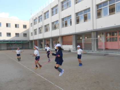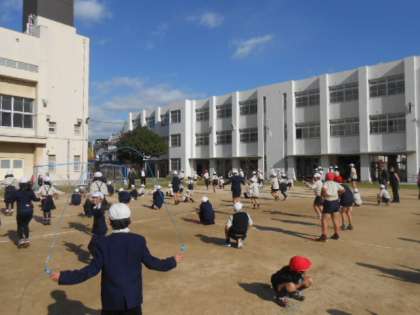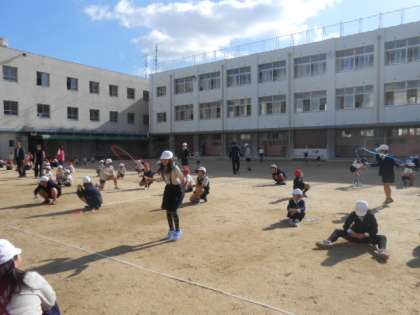 残り2分は、全校一斉に同じ跳び方に挑戦し、引っかかったら、その場に座ります。