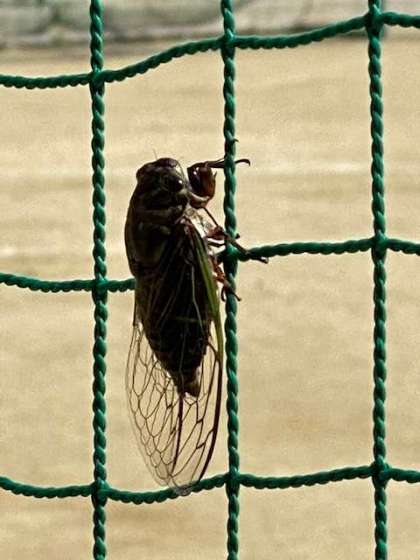 ふと、防球ネットを見ると、何やらくっついているものが。