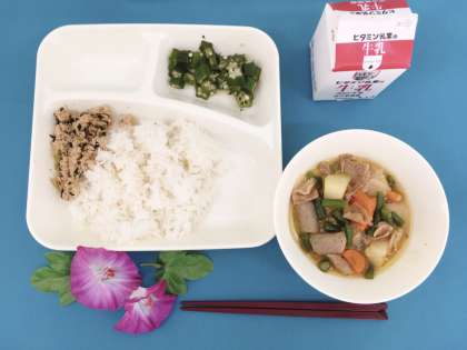 【ごはん、豚肉とじゃがいもの煮もの、オクラの梅風味、ツナっ葉いため、牛乳】