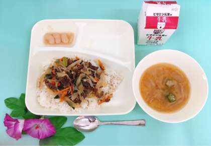 【ごはん、牛丼、とうがんのみそ汁、大福豆の煮もの、牛乳】