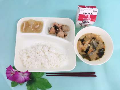 【ごはん、さけのつけ焼き、みそ汁、とうがんの煮もの、牛乳】
