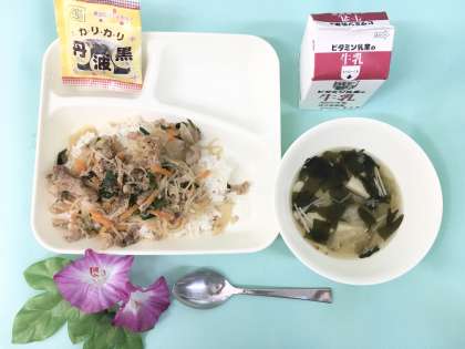 【豚丼、すまし汁、いり黒豆、牛乳】