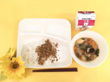 【ごはん、鶏肉とじゃがいもの煮もの、紅ざけそぼろ、牛乳】