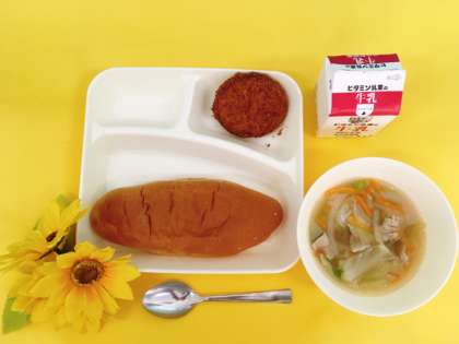 【チキンレバーカツ、スープ、黒糖パン、牛乳】