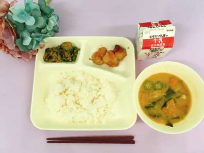【ごはん、鶏肉のてり焼き、みそ汁、なすのそぼろいため、牛乳】