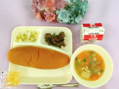 【コッペパン、牛肉の香味焼き、スープ煮、サワーキャベツ、マーマレード、牛乳】