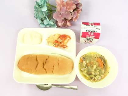 【鶏肉とてぼ豆のスープ煮、じゃがいもとトマトのチーズ焼き、プ なし(二十世紀)、おさつパン、牛乳】