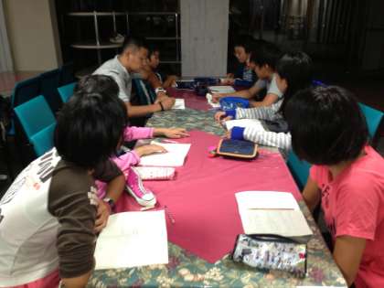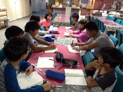 今日の反省や明日の予定について話し合っています。早く寝るように指示もでました。