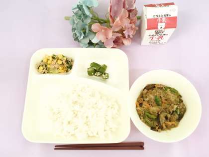 【ごはん、マーボーなす、オクラの甘酢あえ、ツナとチンゲンサイのいためもの、牛乳】