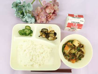 【ごはん、肉じゃが、焼きなすのみそだれかけ、あっさりきゅうり、牛乳】