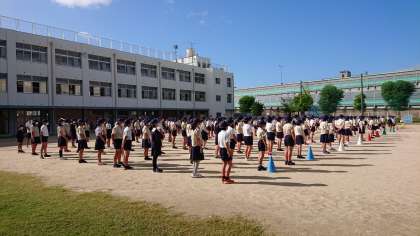新型コロナウイルス感染症対策の一環として、これまでリモートで校長室と教室を繋いで行われてきた児童朝会ですが、今年度初めて運動場で実施しました。