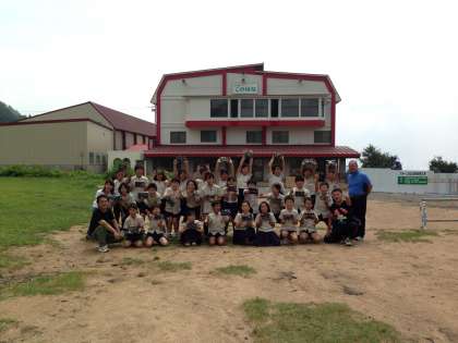 昼食前に時間ができたので宿舎をバックに集合写真。もうすぐ自然体験学習の全てのプログラムが終了します。
