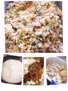 熱々の炊きたてのごはんと、きんぴらの具を合わせたら急いで混ぜます!(この工程を6回行います。)
