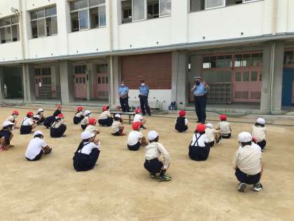 まず、道路で遊ばないことと道路へは飛び出さないこと、道路の渡り方など教えていただきました。そのあと、運動場に描いた道路を右左右と安全を確認して歩く練習をしました。