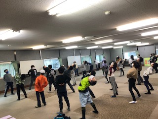 昨晩はよく雨が降ったので、朝の集いは屋内で行いました。