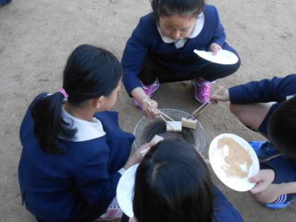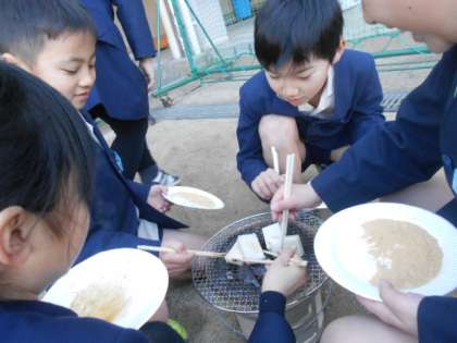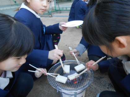 焦がさないように、みんな真剣な表情でお餅とにらめっこしています。