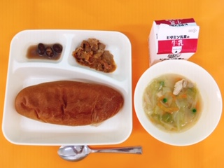 【豚肉のデミグラスソース、スープ、うずら豆のグラッセ、黒糖パン、牛乳】