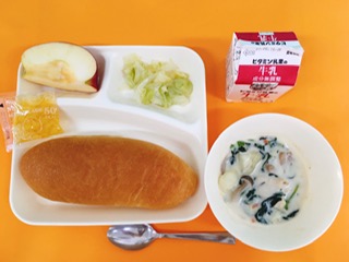 【きのこのクリームシチュー、キャベツのピクルス、りんご、コッペパン、マーマレード、牛乳】