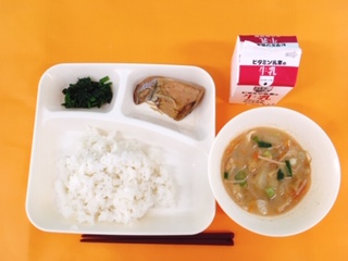 【ごはん、なまりぶしのしょうが煮、みそ汁、ほうれんそうのおひたし、牛乳】
