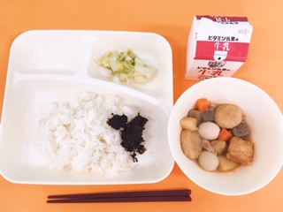【ごはん、関東煮、はくさいの甘酢あえ、のりのつくだ煮、牛乳】