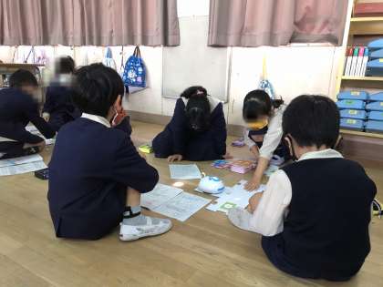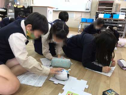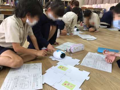 アリロを使ってプログラミング学習をしています。今は、コースに置かれたクッキーを全部取るには、どうアリロを動かせばいいかを自分で考えて、どのボタンを押せばいいか決めて試しています。思った通りアリロが動くとグループのみんなから拍手がおこります。