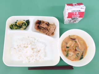 【ごはん、豚肉のしょうが焼き、さつまいものみそ汁、きくなとはくさいのごまあえ、牛乳】