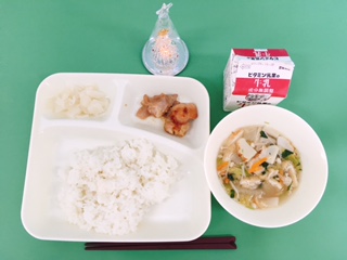 【ごはん、鶏肉のしょうゆマヨネーズ焼き、五目汁、かぶのゆず風味、牛乳】